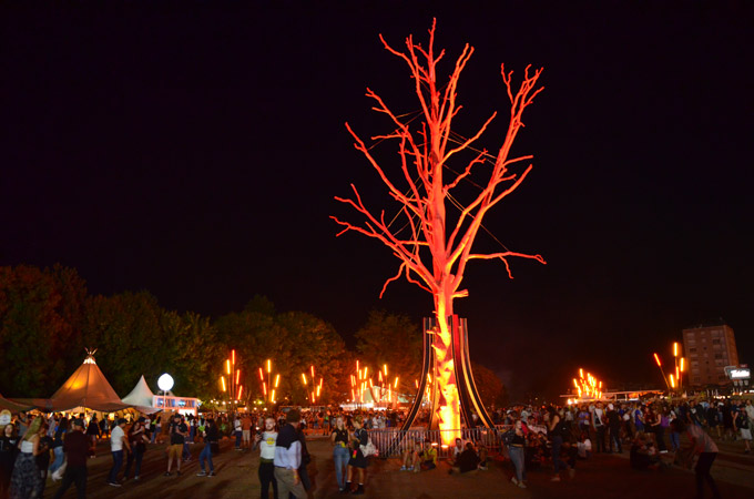 Nous sommes arrivés le 19 Août et c’est avec émerveillement que nous savourons la déco de cette nouvelle édition du festival. La scène Razorback et son univers à la Mad Max, véritable temple du rock, les deux énormes scènes Illumination et Zanzibar et la Greenfloor en pleine forêt de l’autre côté de la Meuse et puis cet immense arbre rouge qui se dresse tel un symbole. On imagine déjà le spectacle lumineux une fois la nuit tombée.