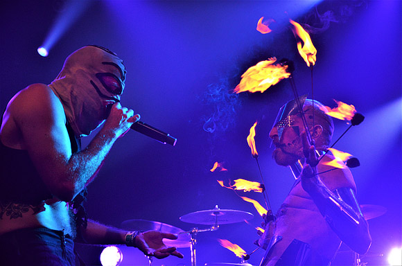 On monte encore d’un cran avec Krav Boca. Honte à moi de me pas connaitre ce groupe qui correspond tout à fait à ce que j’aime. Formé en 2014, Krav Boca, mélange punk, rap et performance scénique. Et c’est vraiment la claque, les titres sont brut, secs, fédérateurs et violents. La tension ne se relâche pas ! Adepte du DIY, Krav Boca balance un spectacle hypnotique mêlant l’énergie du punk et du rap à l’intensité des arts de la rue, de la danse et de la pyrotechnie. Je pense forcément aux Bérurier Noir ou La Raïa. On en prend plein les yeux et les oreilles! Ainsi l’on croise sur scène des démons en feux, des rappeurs cagoulés, des hybrides expérimentés, des urgences psychiatriques, des animaux blessés (en imitation), des déesses flambées sans visage, un forgeron à la disqueuse folle. Et surtout une unité imparable, on ne peut détourner nos yeux, tant il y en a à voir. Ce groupe est complétement perché. J’ai adoré !