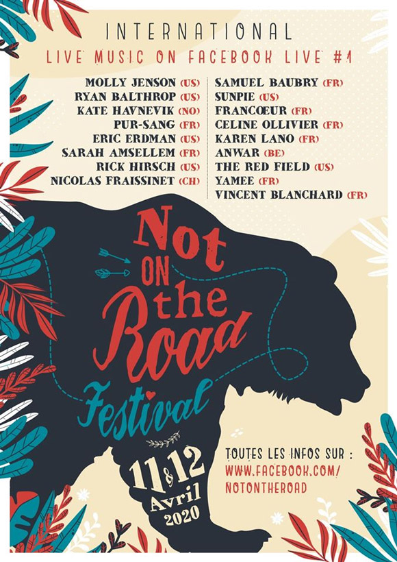Un festival en ligne sans frontières, c’est ce que proposent Claire Joseph et Skye du duo Folk Français Pur-Sang en organisant le « Not On The Road Festival » du 11 au 12 Avril 2020 sur la toile, un événement qui réunit artistes de tous pays et de tous horizons musicaux. Une belle initiative à savourer pour un week end de plaisirs ! (Avril 2020 – par Hervé Collet.)