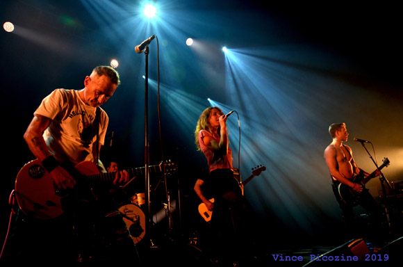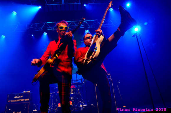 Arrivée explosive sur scène !!! Olga à la guitare et au chant, Tommy Goober à la basse et The Amazing Mr Duncan à la batterie. Tous trois dans de jolis costumes rouges, pantalons écossais, mini cravates, un brin étriqués. Ils semblent tout droit sortis d’une bd ou d’un dessin animé et nous emmènent dans des aventures des plus cocasses et désopilantes au travers d’une petite trentaine de titres retraçant toutes ces années délirantes mais aussi de nombreux titres du dernier album « Episode XIII » qui est une pure merveille. À noter d’ailleurs que la pochette de ce nouvel album a été réalisée par notre pote Chester et sans déc’c’est sûrement la plus belle de toute leur discographie !!!